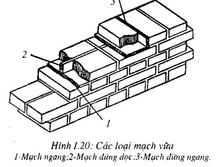 Mạch vữa có nhiệm vụ lấp đầy các mối nối giữa các viên gạch trong khối xây. Trong một khối xây có mạch vữa ngang và mạch vữa đứng (Hình 1.20).