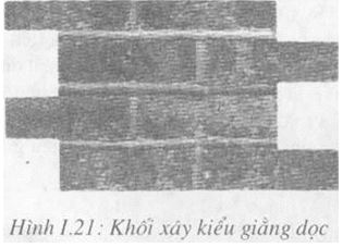 a. Khối xây với kiểu giằng dọc (kiểu chữ công) (Hình I.21): Mạch đứng các hàng gạch liền nhau lệch nhau 1/2 viên gạch. Kiểu này được dùng để xây tường 60mm. 110mm, xây đáy bể nước, xây thành bể nhỏ có chiều cao thấp và tường thành bể dày 220.