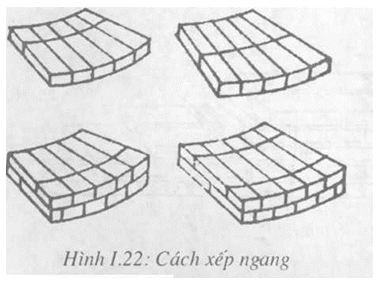 b. Khối xây với kiểu giằngb. Khối xây với kiểu giằngngang: Là đặt ngang một viên gạch lên trên mạch đứng sao cho các mạch đứng của các hàng gạch liền nhau so le nhau 1/4 viên gạch. Kiểu giằng theo chiều ngang, trong đó ở tất cả các hàng các viên gạch đều nằm ngang; dùng xây các bộ phận có dạng hình tròn, như ống khói, bể tròn, tháp nước,… (Hình I.22 ).