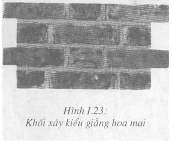 c. Khối xây với kiểu giằng ngang hoa mai (Hình 1.23): Còn gọi là kiểu xây Flemish, rất được ưa chuộng kể từ sau thế kỷ 17. Ở nước ta kiểu này xưa thường được dùng để xây tường ngoài nhà ở nông thôn, mặt ngoài tường dùng gạch lành, mặt trong dùng gạch vỡ hoặc đất sét để tiết kiệm vật liệu.