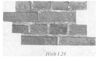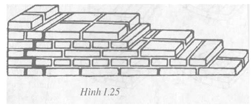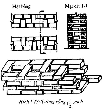 Tường gạch 1 — (Hình 1.27) các dãy gạch ở phía ngoài đặt dọc, cứ hai viên đặt dọc có một viên đặt ngang, các viên đặt ngang chỉ hiện ra một đầu ở mặt tường gọi là gạch lộ đầu. Cách đặt gạch này luân phiên thay đổi ở mỗi hàng.