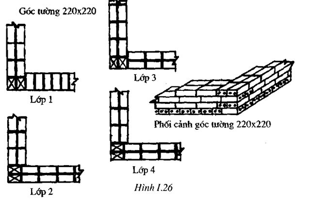 khối, chỉ khác là các mạch đứng của các hàng gạch dọc không trùng nhau cứ cách mỗi hàng, mà cách mỗi ba hàng. Để cho các mạch đứng của những hàng liền nhau lệch đi 1/4 gạch, đồng thời các mạch của những hàng gạch dọc lệch nhau 1/2 gạch, người ta khởi đầu xây những hàng gạch ngang bằng 2 viên 3/4 (cho khối xây 1 gạch), khởi đầu xây những hàng gạch dọc bằng một và hai viên gạch đặt ngang, cứ mỗi bốn hàng một lần (Hình 1.25).
