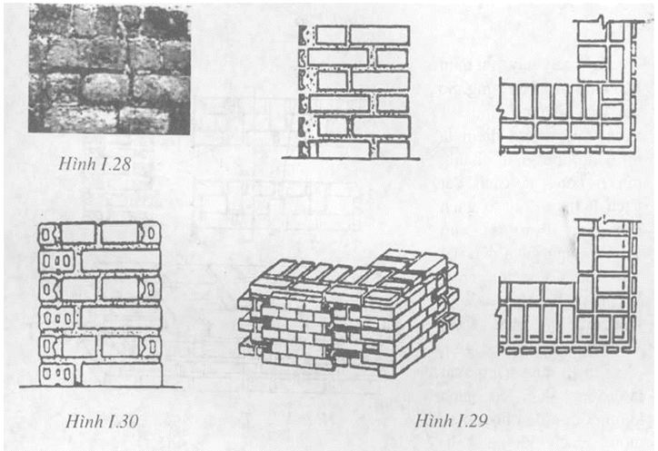 Với khối xây gạch trần người thường sử dụng 2 loại gạch: gạch thông thường đặt bên trong, gạch trang trí (gạch gốm,…) đặt bên ngoài, dặt xen kẽ 1 hàng gạch nguyên đến một hàng gạch bổ đôi để các mạch dứng lệch nhau. Những mạch đứng của mặt tường lệch nhau 1/2 gạch và có nét nhỏ, các mạch dọc thì to hơn (Hình 1.30).