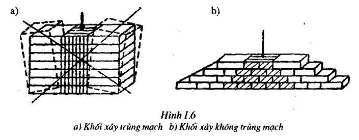 Mạch đứng của hai hàng gạch liền nhau phải lệch nhau ít nhất 5cm, để từng viên gạch trong khối xây cùng tham gia chịu lực (Hình I.6a). Nếu khối xây có mạch trùng từng bộ phận của khối xây sẽ làm việc độc lập dễ dẫn đến nứt gẫy hoặc lún không đều (Hình I.6b).