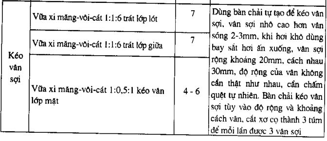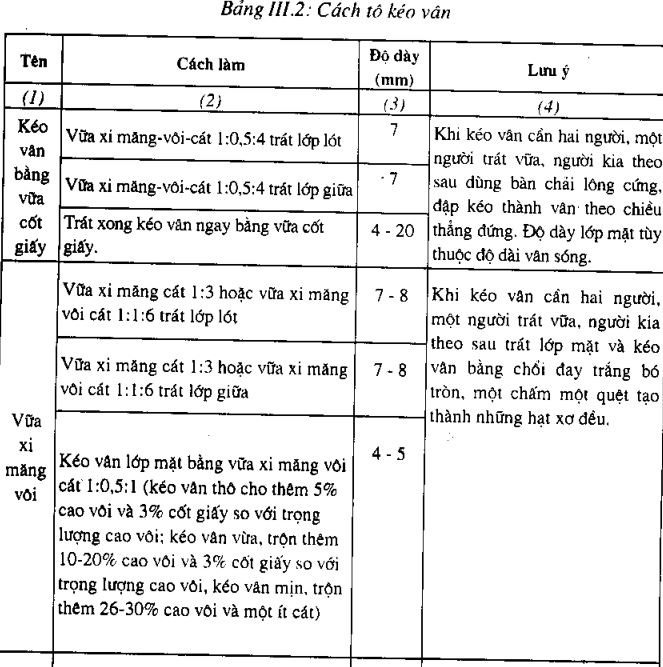 Trước tiên cần trộn và thử mẫu. Sau đó vẩy nước lên bề mặt lớp vữa trát nén đâ khô 6-7 phần; độ ẩm vừa phải, sau đó trát lớp vữa hoàn chỉnh và kéo vân cùng lúc, làm từ trên xuống dưới cùng một lượt, yêu cầu hoa vẫn phải đều, đồng màu không để lại vệt nối, Cách làm xem bảng III.2.
